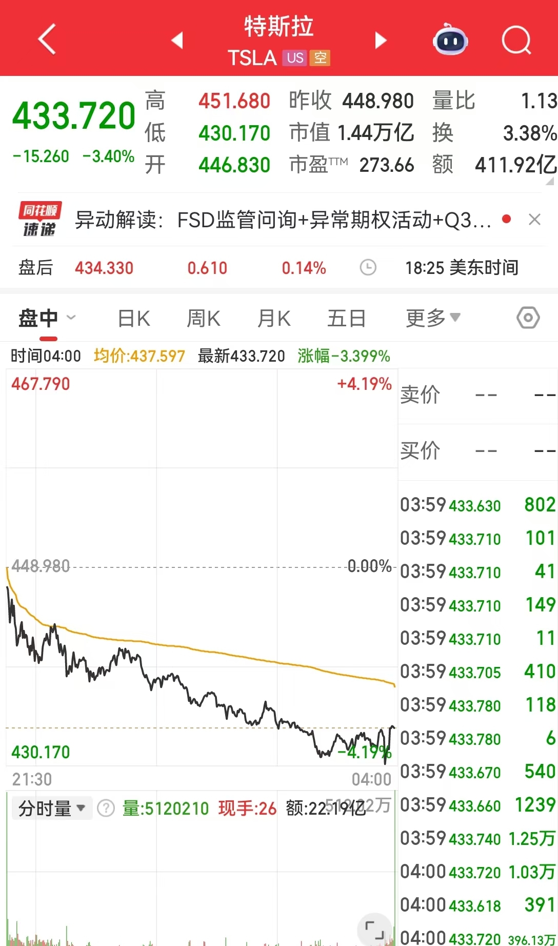 特斯拉报433.72美元,跌3.40%,市值1.44万亿美元,其市值一夜蒸发508亿美元(约合人民币3618亿元)。